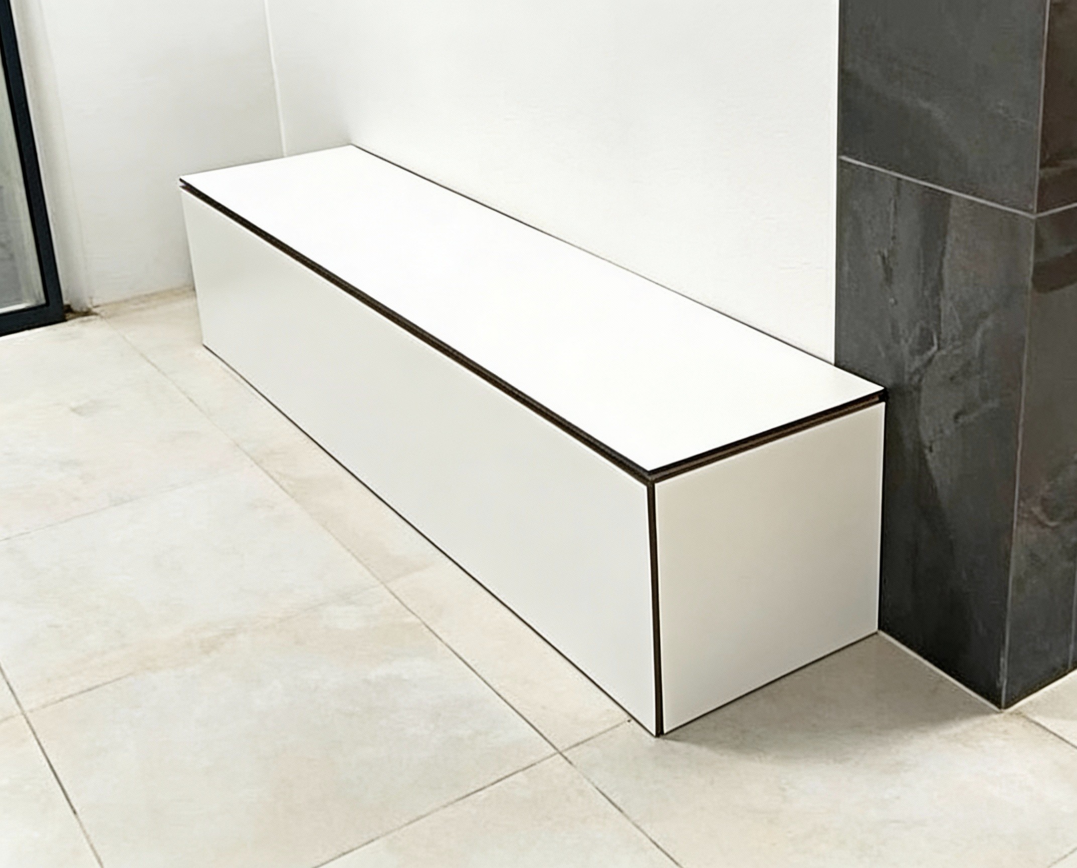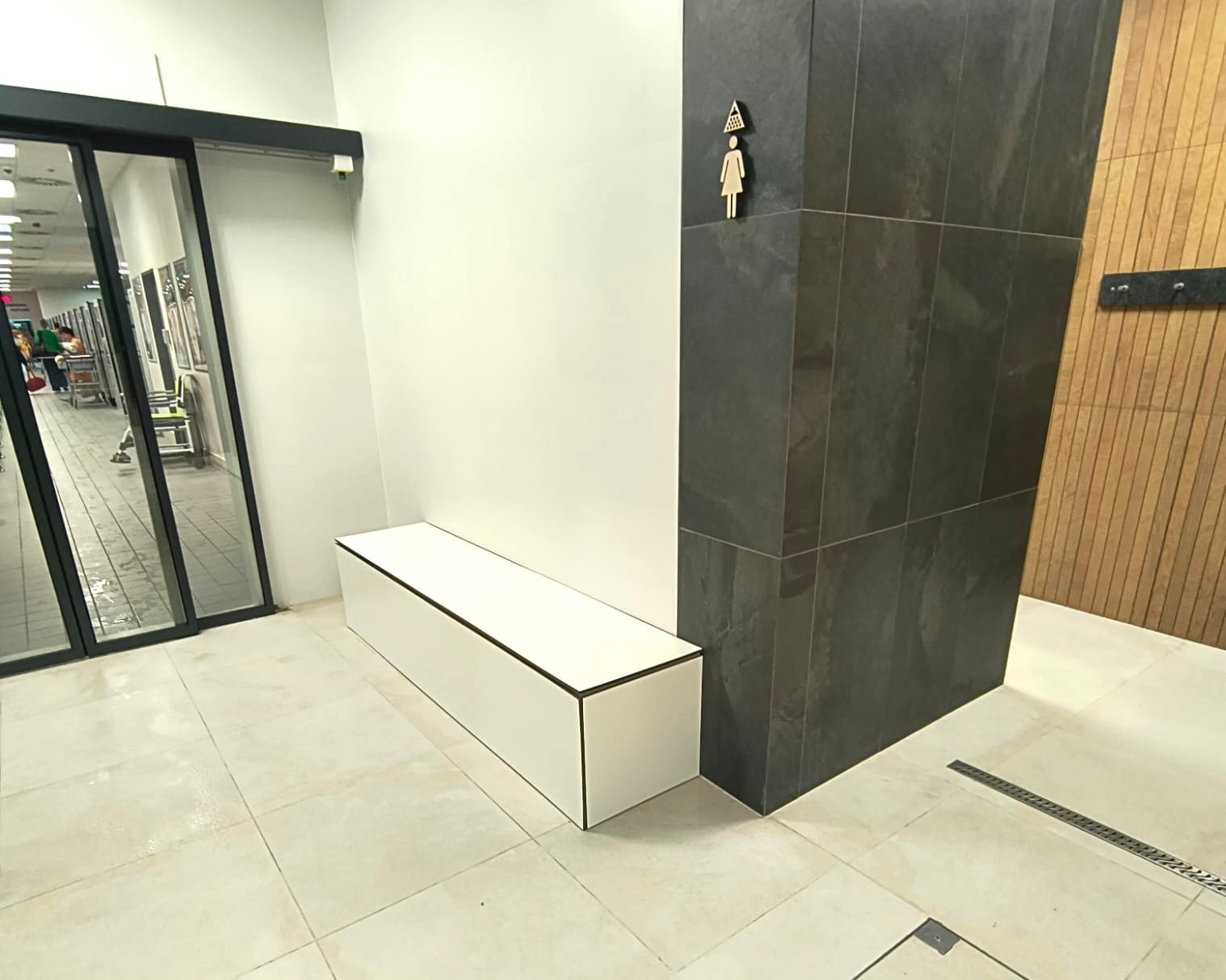 Uzupełnieniem realizacji jest ławka typu box z białego laminatu, która doskonale komponuje się z zabudową przebieralni i zapewniaja użytkownikom komfort podczas korzystania z obiektu.