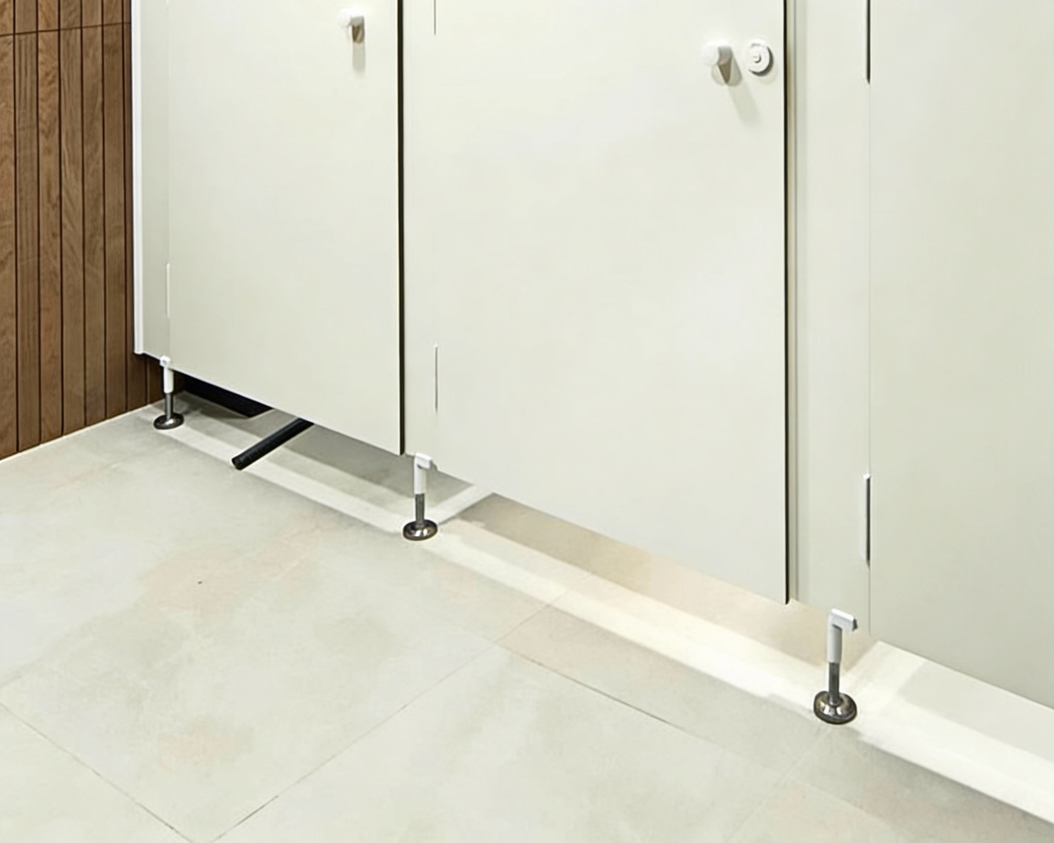 Zabudowy wykonaliśmy z białego laminatu HPL Compact, uzupełnionego o profile aluminiowe malowane proszkowo na biało. Jasna kolorystyka doskonale wpisuje się w nowoczesne wnętrze obiektu, w którym zastosowano drewnopodobne okładziny, kontrastowe czarne elementy oraz jasną posadzkę.