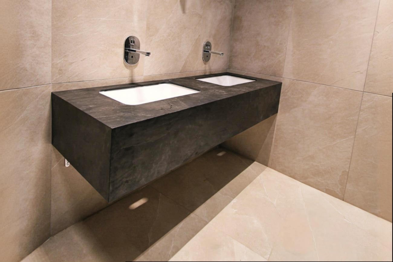 Centralnym elementem realizacji są blaty pod umywalki wykonane z laminatu HPL w wersji premium, o ciemnym, kamieniopodobnym wykończeniu. Materiał ten doskonale imituje naturalny kamień, jednocześnie zachowując wszystkie zalety HPL – odporność na wilgoć, łatwość utrzymania czystości oraz wysoką trwałość przy codziennym użytkowaniu.
