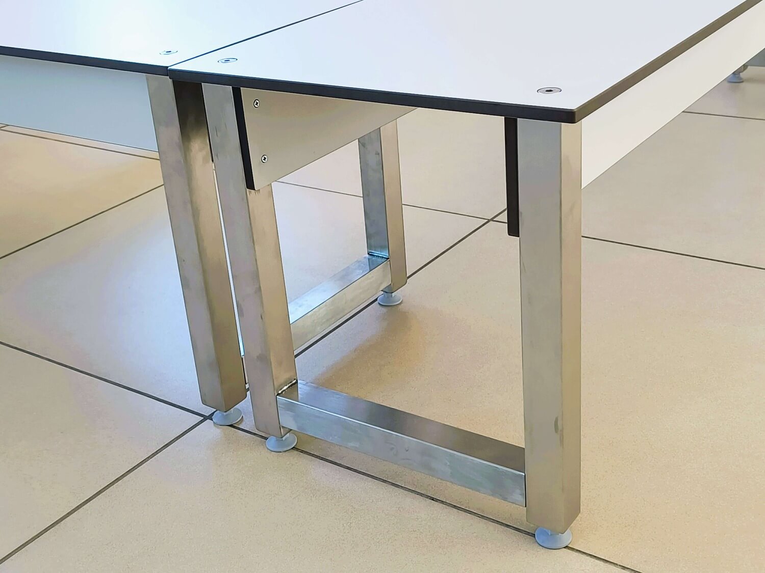 Szafki osadzono na nogach z rur aluminiowych malowanych proszkowo, co nadaje im stabilność, lekkość i nowoczesny wygląd.